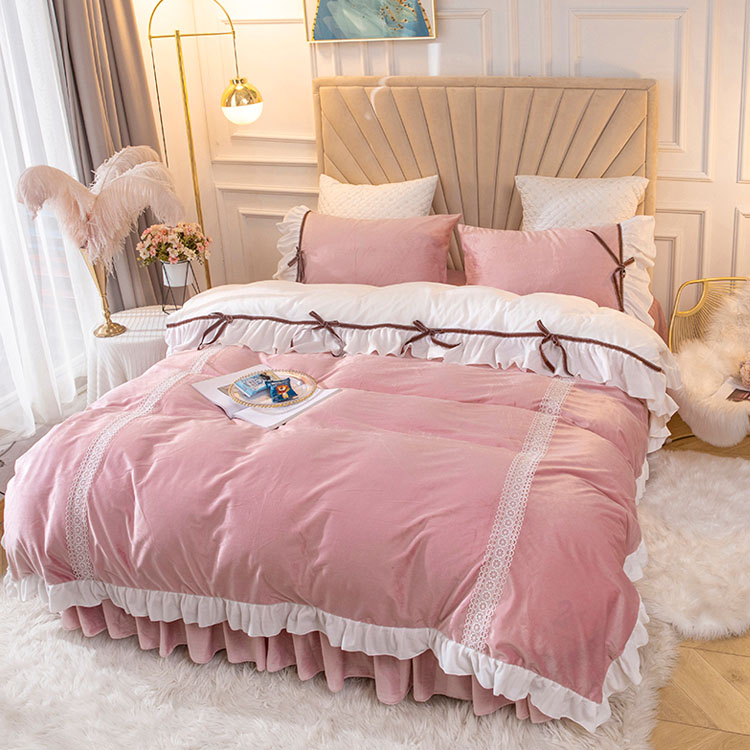 送料無料 全3色 布団カバーセット 冬 韓国風 レース フリル リボン 可愛い 寝具カバーセット 4点セット ダブル 洋式 和式 オシャレ 掛け布団カバー 敷きカバー 無地 フランネル 暖か ベッド用品 ベッドスカート ロマンチック ピンク ベージュ グリーン 本店は